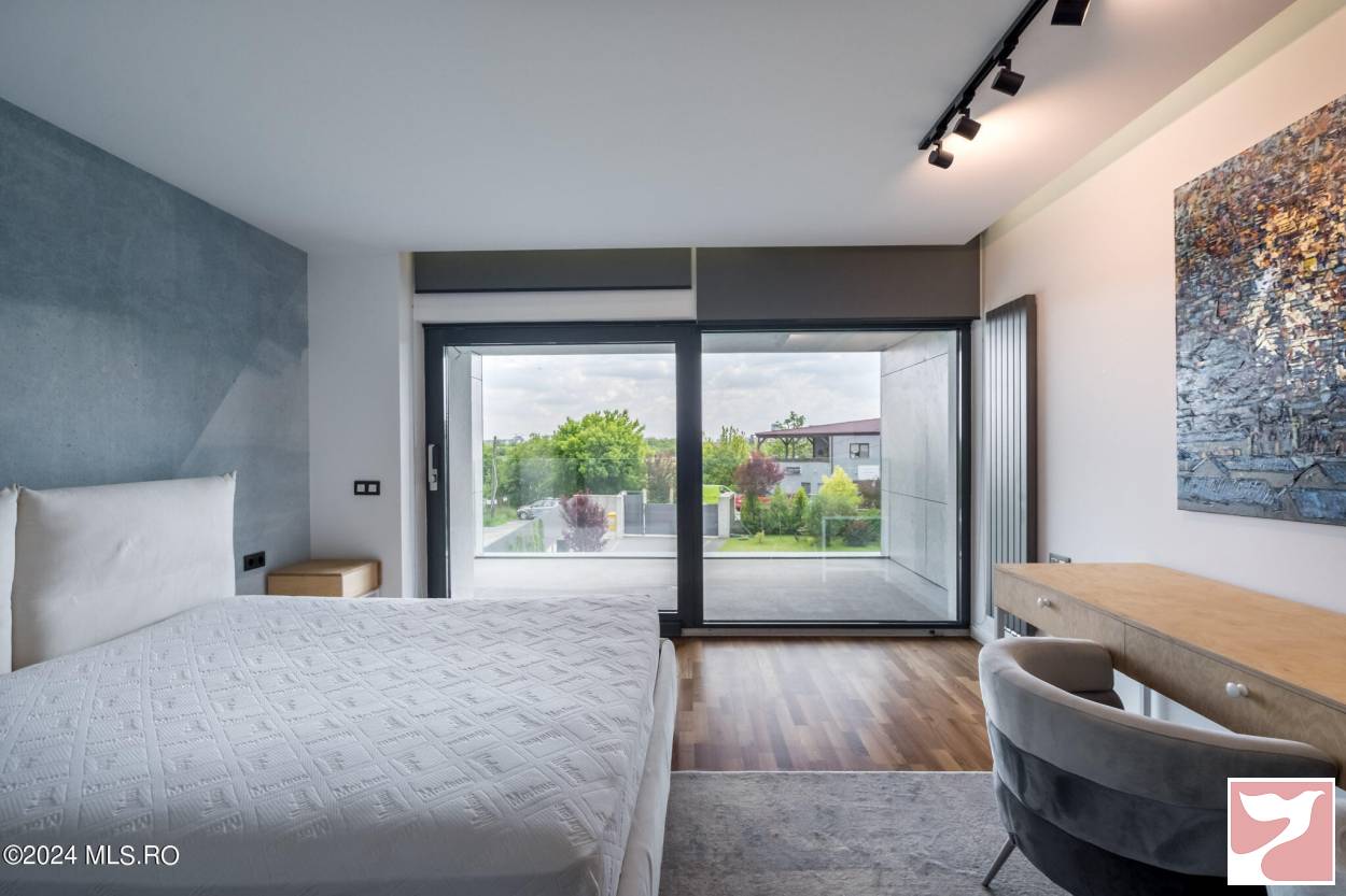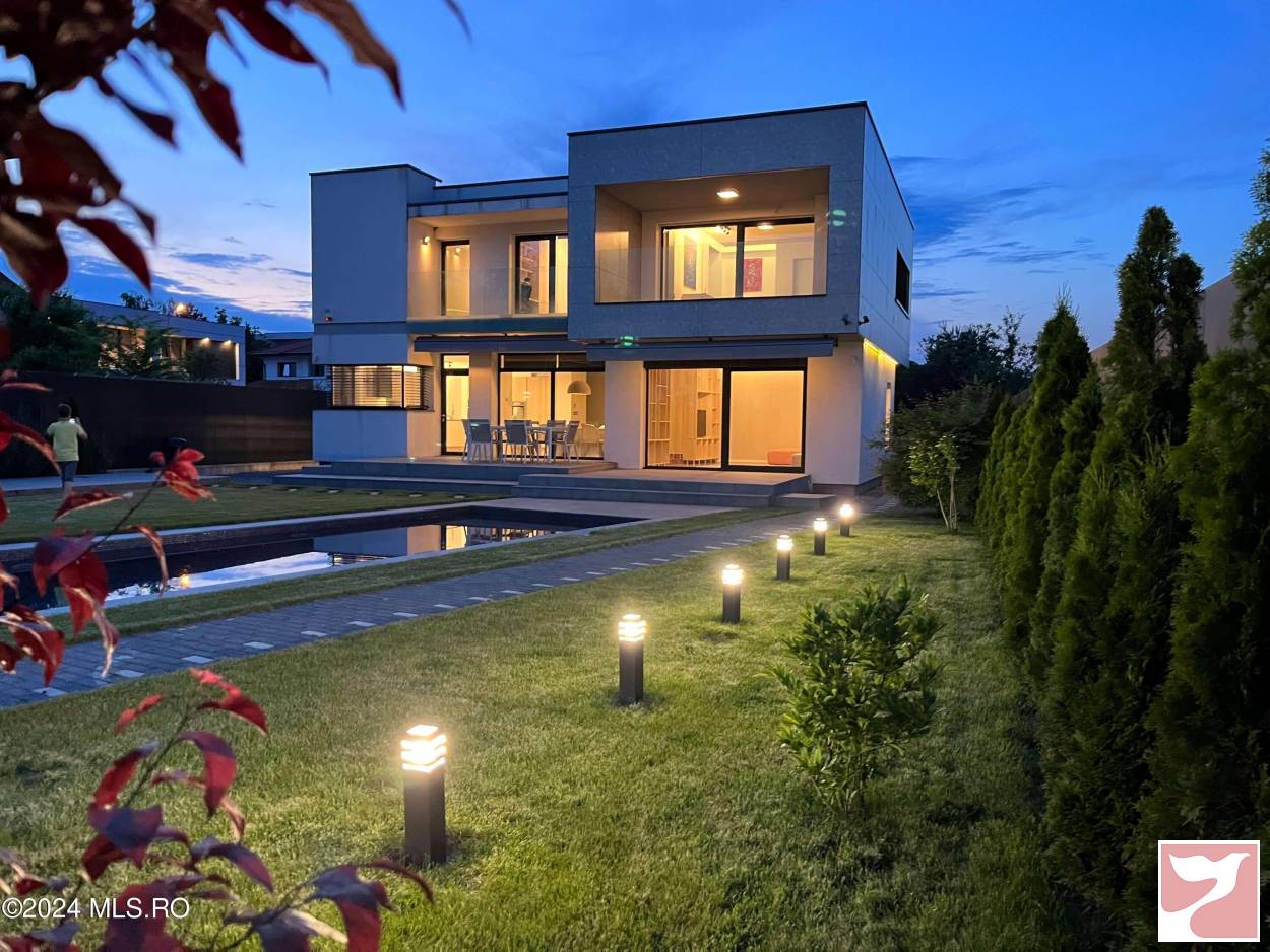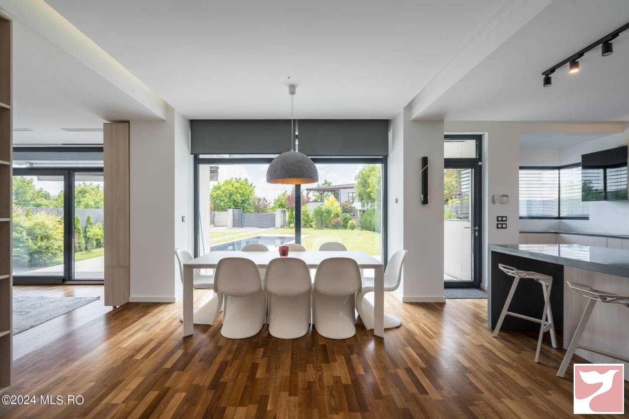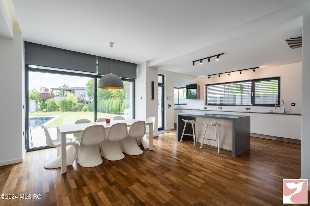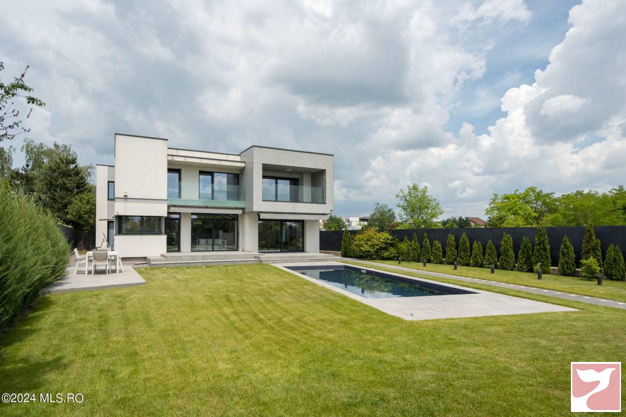 Designed for a family that values both space and aesthetics, this standalone villa located in Iancu Nicolae combines modern architecture with understated elegance.On the ground floor, the dining area and open-space kitchen form an exceptionally bright space, with a glazed facade opening onto the yard and pool.The living room, visually separated by architectural elements, remains connected to the entire daytime area, maintaining a sense of flow and transparency between the indoors and outdoors.The upper floor offers four well-proportioned bedrooms, complemented by two bathrooms and spacious walk-in closets.Among the auxiliary spaces are a sauna, storage areas, and carefully integrated details for daily comfort.